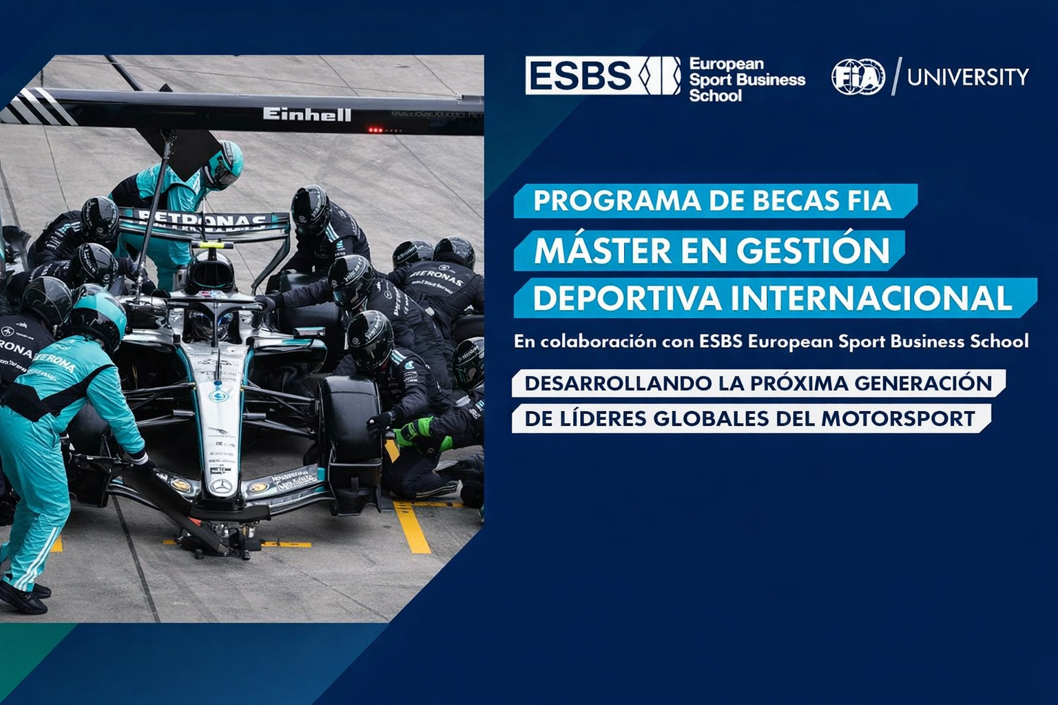 Impartida en colaboración con la ESBS, la iniciativa permitirá al becario de la FIA cursar un Máster en Gestión Deportiva Internacional. Clasificada en el puesto 18 a nivel mundial, 5ª en Europa y nº 1 en España por su programa presencial de gestión deportiva, la ESBS combina la excelencia académica con la experiencia práctica, preparando a los graduados para tener éxito en la industria deportiva global. El programa está destinado a candidatos con experiencia en el automovilismo que estén preparados para dar el siguiente paso hacia funciones profesionales de liderazgo y gestión.