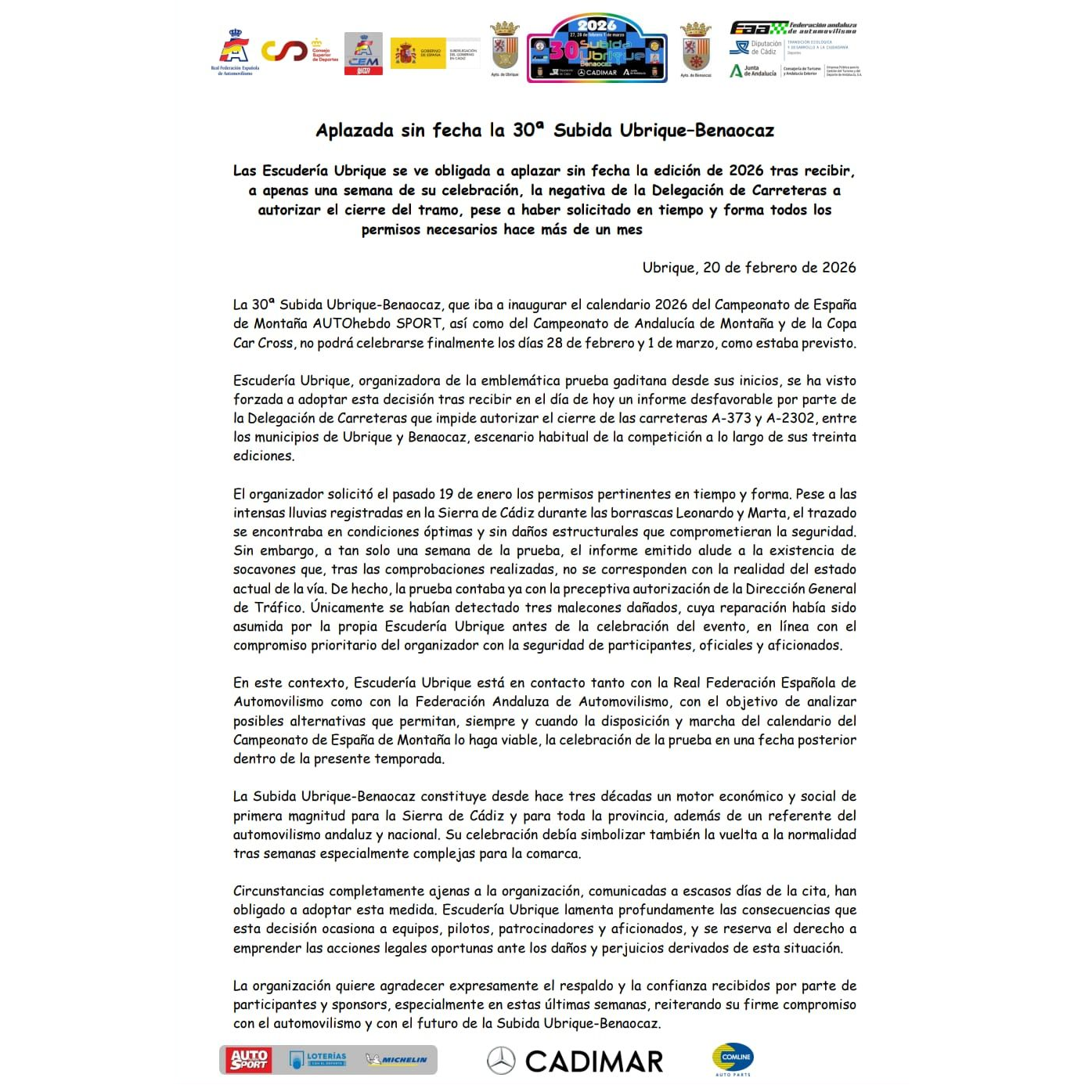 La 30ª Subida Ubrique-Benaocaz, que iba a inaugurar el calendario 2026 del Campeonato de España de Montaña AUTOhebdo SPORT, así como del Campeonato de Andalucía de Montaña y de la Copa Car Cross, no podrá celebrarse finalmente los días 28 de febrero y 1 de marzo, como estaba previsto.
